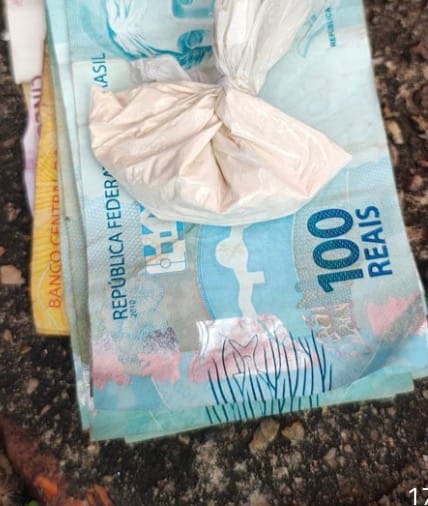 Durante a revista, os policiais encontraram uma porção de substância análoga à cocaína e a quantia de R$ 1.262 em dinheiro trocado, característica comumente associada à venda de drogas.
