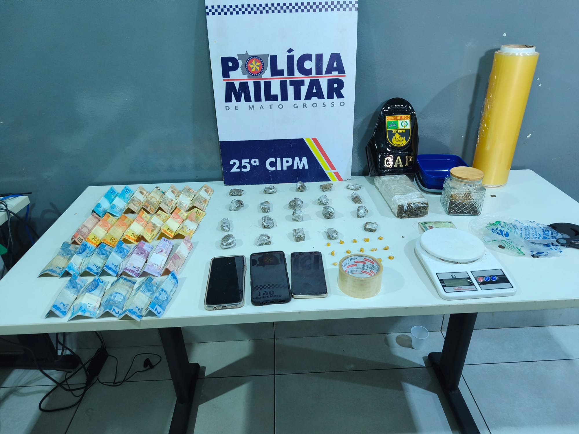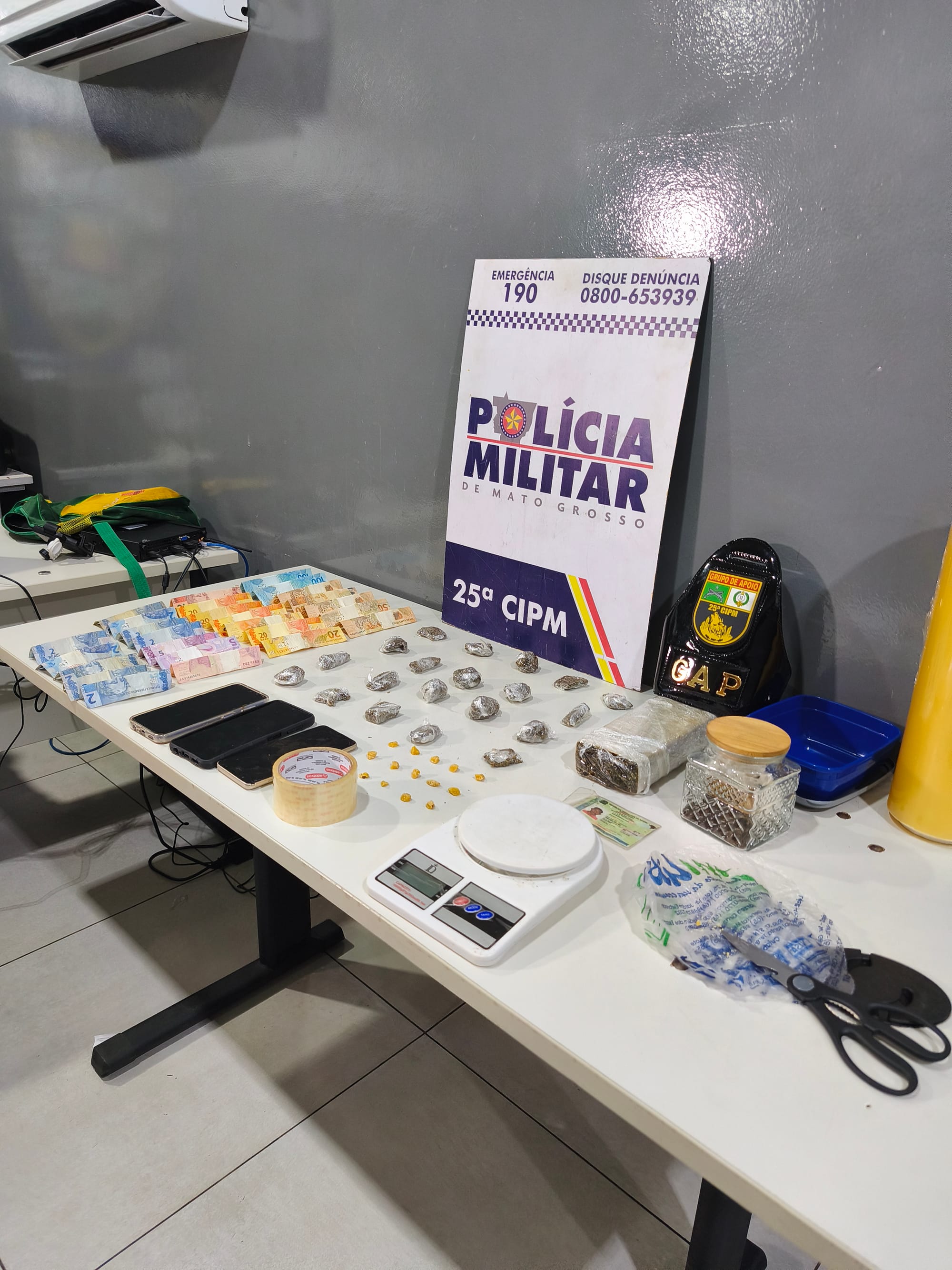 Questionado, o casal acabou informando que havia mais entorpecentes em uma kitnet próxima, onde residiam. No local indicado, os policiais encontraram um tablete de maconha, 15 porções de pasta base de cocaína, além de balança de precisão, plástico filme e tesoura, materiais comumente utilizados para o preparo e a comercialização de drogas.