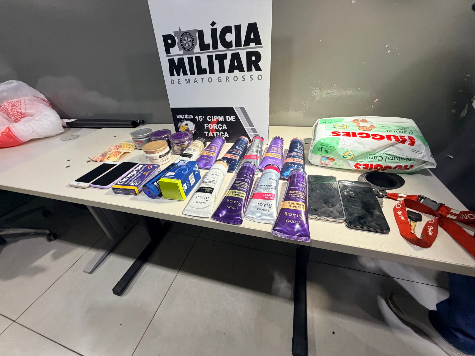 Quando a equipe policial chegou, as suspeitas já estavam do lado de fora, próximas às motocicletas utilizadas na ação. Durante a abordagem, foram encontrados diversos produtos furtados, entre eles fraldas, cosméticos, cremes, hidratantes e xampus.