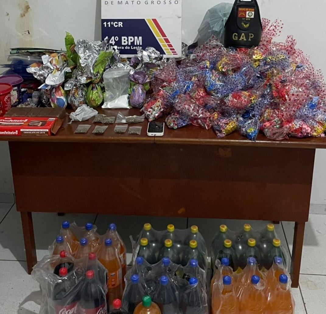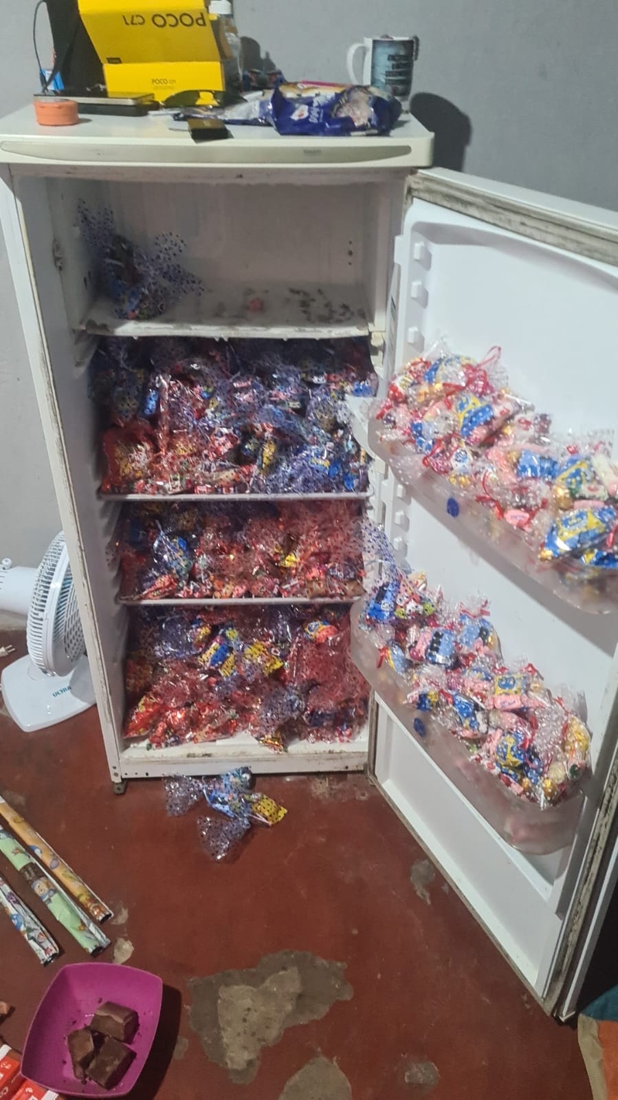 Ao entrar na residência, os policiais flagraram os demais envolvidos e encontraram uma verdadeira “fábrica do crime”: 35 ovos de Páscoa, 36 refrigerantes, diversos doces e materiais utilizados tanto para embalar alimentos quanto para preparar drogas.