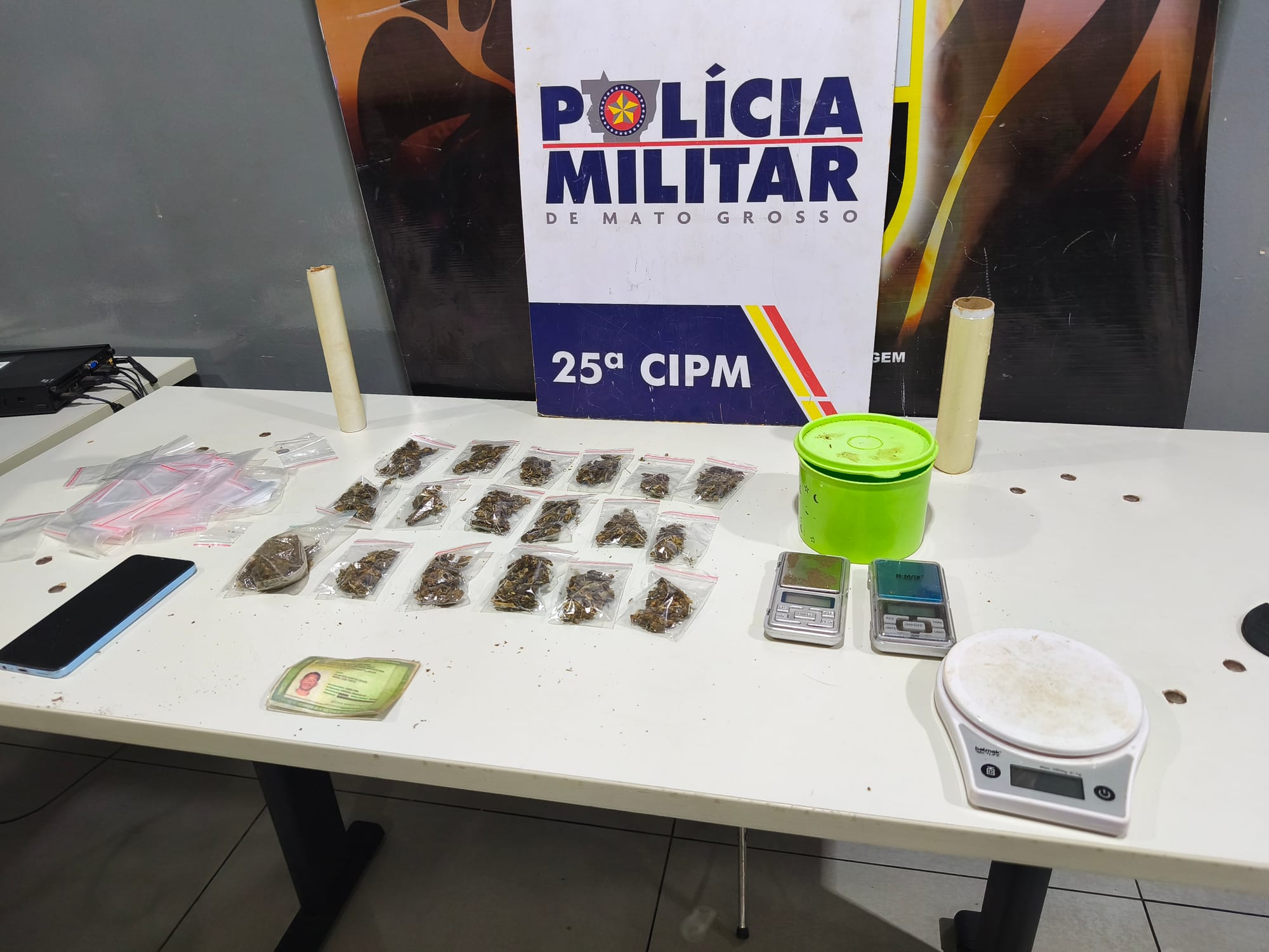 Um jovem de 29 anos foi preso pela equipe do Grupo de Apoio (GAP) do 25º Companhia do bairro São Mateus, em Várzea Grande, após ser flagrado com porções de maconha e materiais utilizados para embalar drogas. A abordagem ocorreu em frente a um local onde funciona uma equoterapia, no bairro Nova Fronteira.