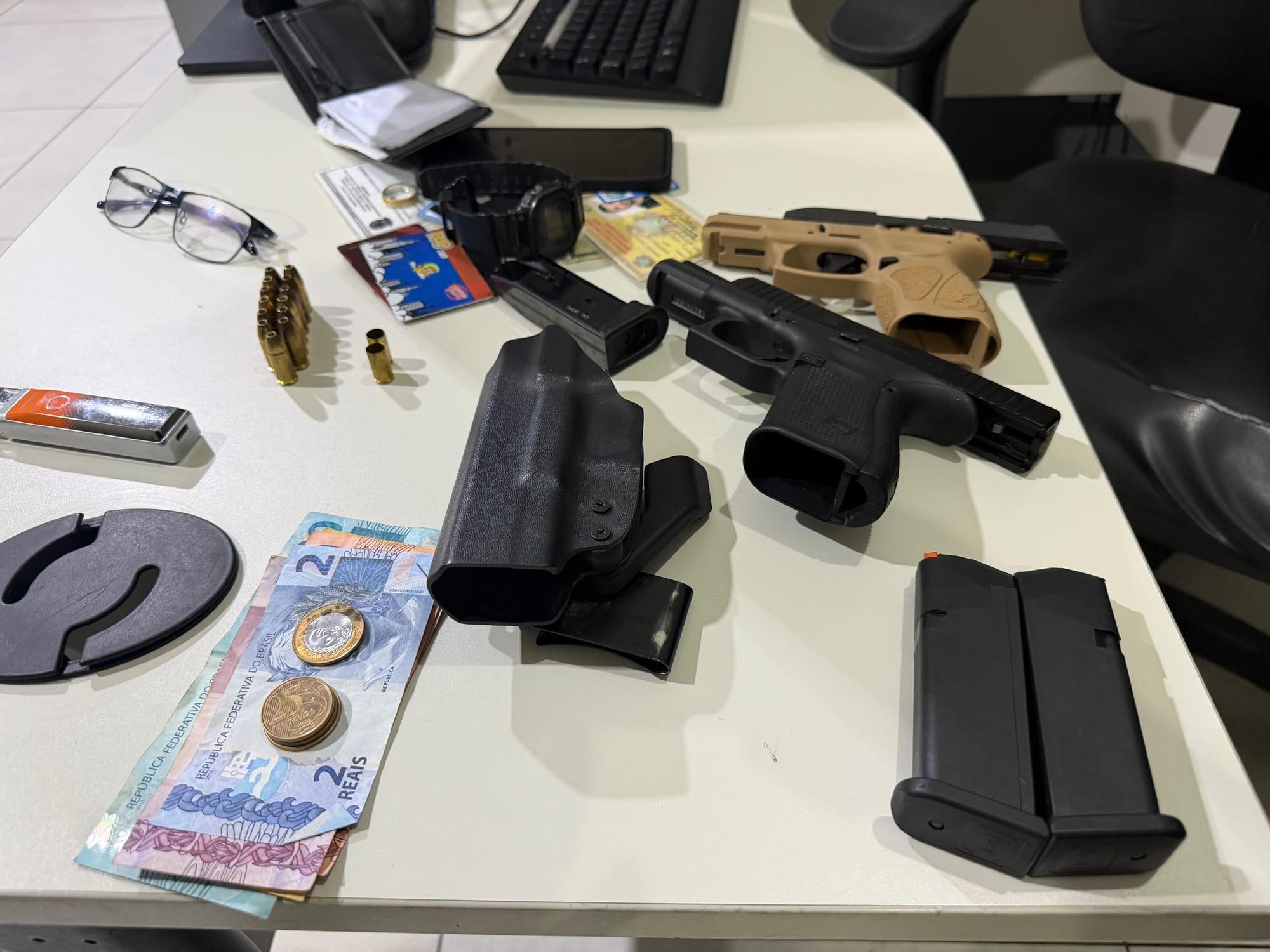 Durante a abordagem, foi constatado que o suspeito estava com duas pistolas e munições — sendo uma arma funcional da Polícia Penal, com o brasão da instituição, e outra arma de uso particular.