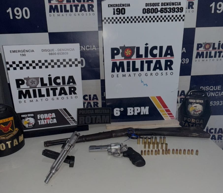 Durante a ocorrência, os policiais apreenderam uma carabina calibre .44, uma pistola calibre .380, um revólver calibre .38 com numeração suprimida, munições, dois aparelhos celulares e o veículo utilizado pelo grupo.