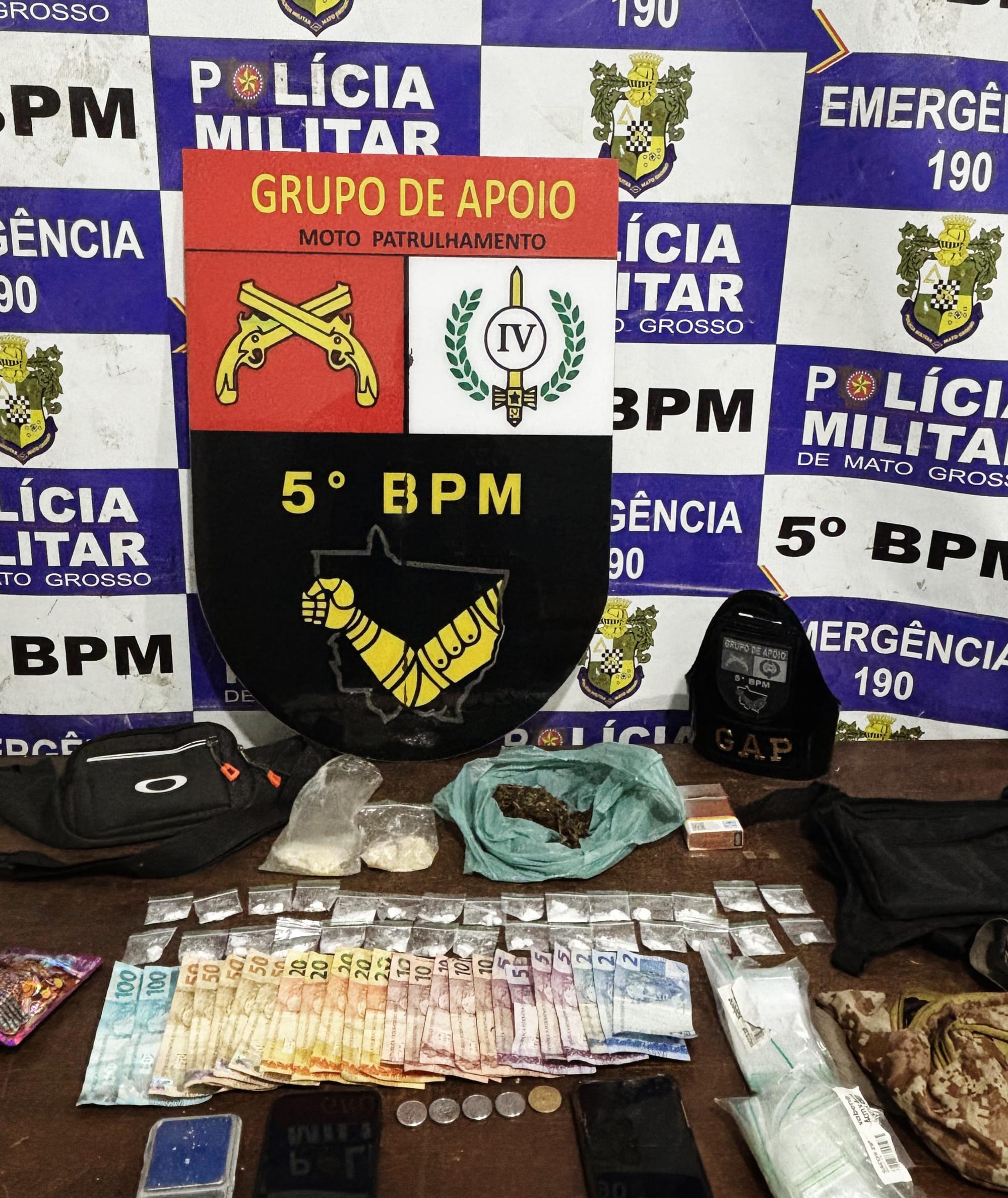 Durante a revista, foram encontradas porções de substâncias análogas à cocaína, pasta base e maconha, além de uma balança de precisão, dois celulares, diversos invólucros para embalo de drogas e R$ 628,25 em dinheiro trocado, que, segundo o próprio abordado, seria proveniente da venda dos entorpecentes.