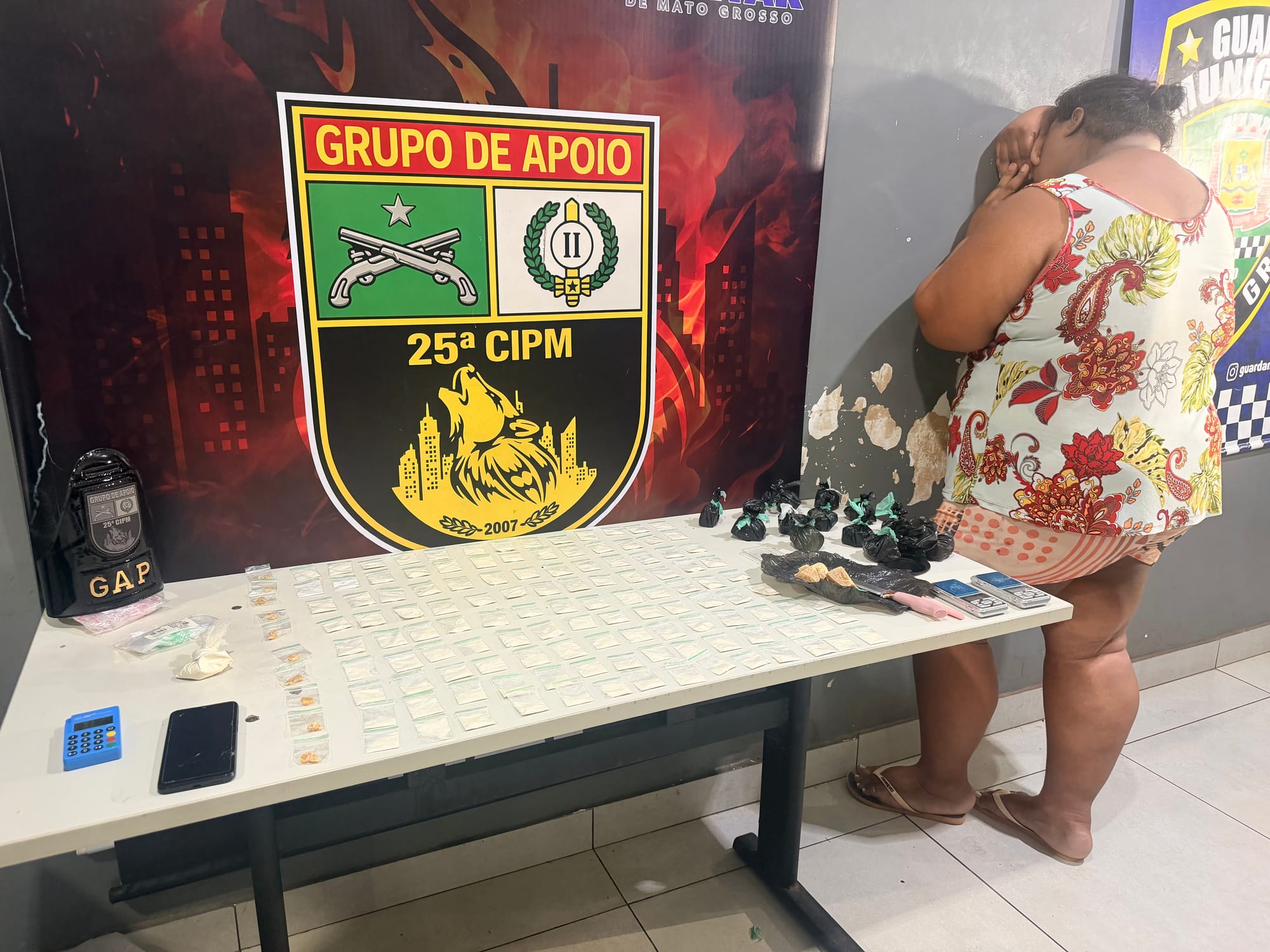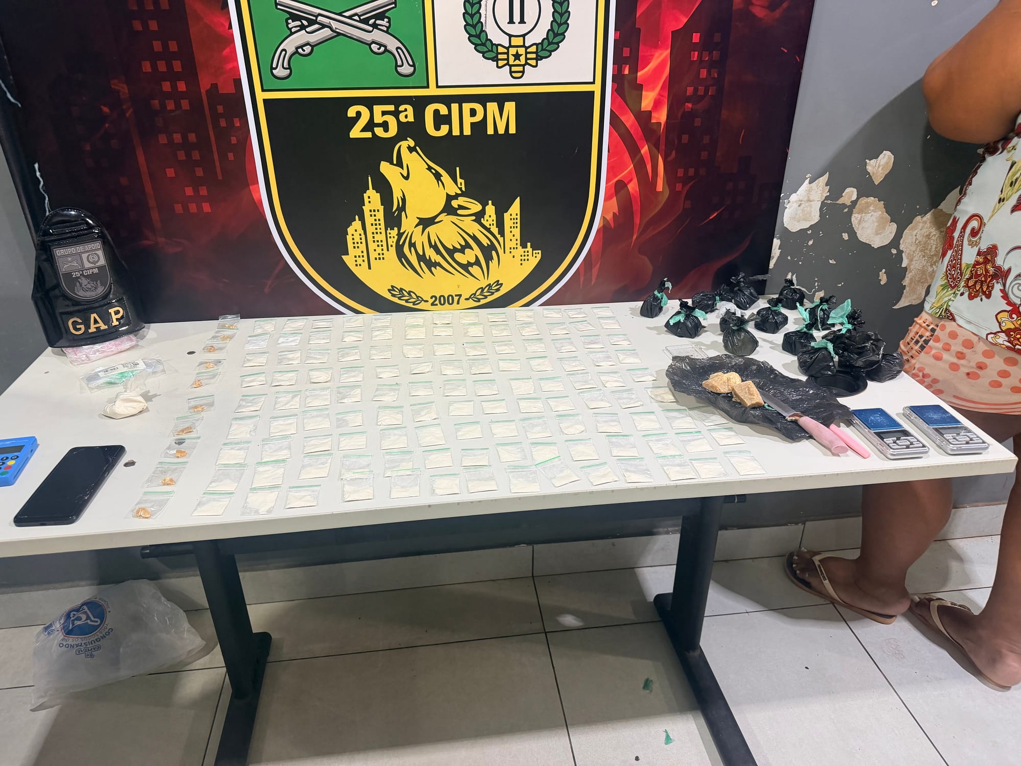 Com base em novas informações, os policiais seguiram até a residência da suspeita, identificada apenas como Débora. No imóvel, foram localizadas mais 91 porções de substância semelhante à cocaína, além de uma porção maior do entorpecente. Também foram apreendidos uma balança de precisão, colher com resquícios da droga, embalagens tipo zíper, uma máquina de cartão e um aparelho celular danificado.