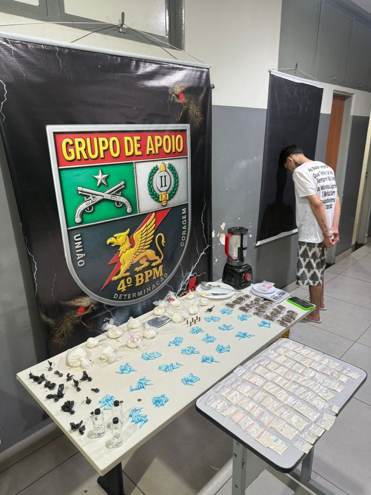 Com o apoio de outra equipe do GAP, os policiais retornaram à residência do suspeito e encontraram um verdadeiro laboratório de drogas. No local havia grande quantidade de entorpecentes, além de materiais utilizados para preparo, mistura e embalagem da droga.